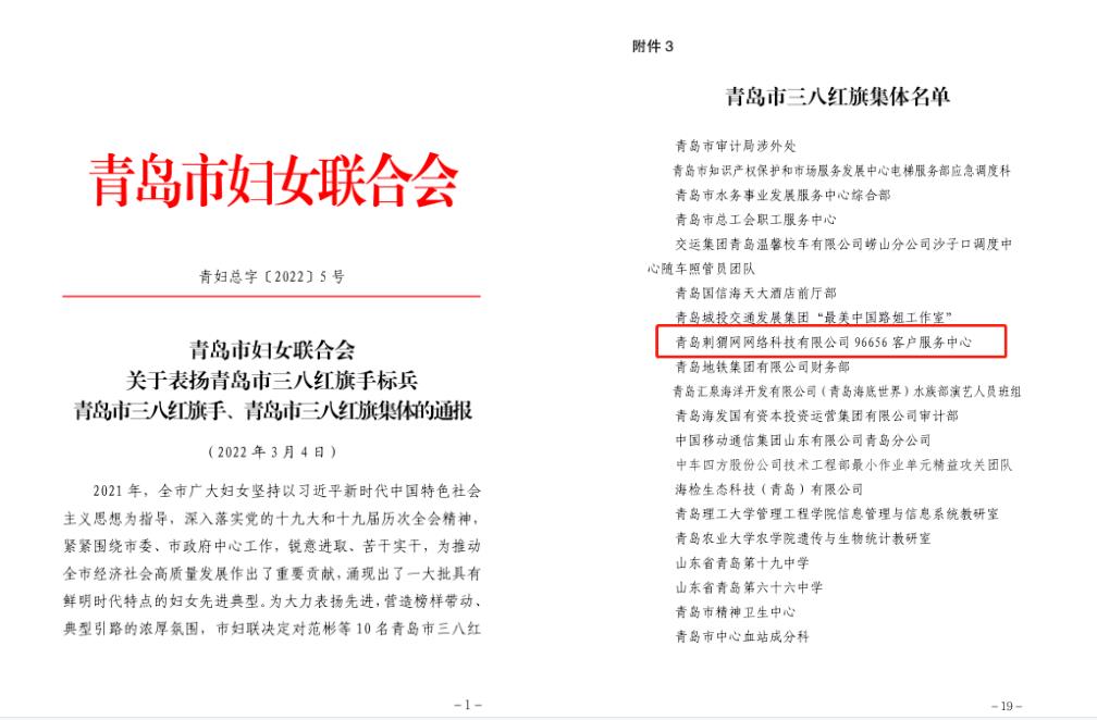 青岛刺猬网网络科技有限公司96656客户服务中心荣获“青岛市女职工建功立业标兵岗”和“青岛市三八红旗集体”称号。